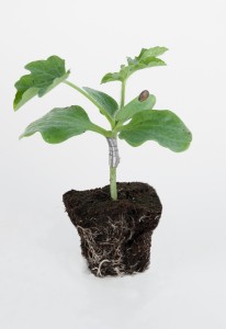 – Pasado un tiempo, cortar el tallo de la sandía por debajo del injerto, y la cabeza del patrón conservando solamente los dos cotiledones y la primera hoja.